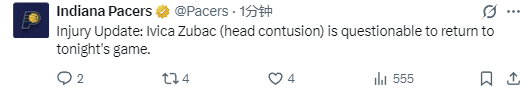 北京时间3月19日,NBA常规赛继续进行,步行者队对阵开拓者队。本场比赛进行期间,祖巴茨因为在防守克林根空接时头部被对手打中,已经返回更衣室。步行者队随后宣布,祖巴茨头部挫伤,本场比赛回归成疑。