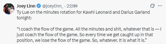 在谈到莱昂纳德和加兰的出场时间问题受到限制的问题时,卢表示:“我只负责根据比赛的节奏来安排出场时间。那些出场时间限制之类的乱七八糟的东西,不管是什么,每次我们纠结这些东西的时候,我们就会丢掉比赛节奏。所以,就这样吧,爱咋样就咋样。”