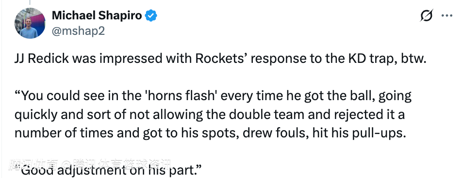 随后,雷迪克也表示自己对火箭应对杜兰特包夹的调整印象深刻:“每次他拿球时都能看到‘牛角位闪切’的战术,他移动得很快,尽量避免被包夹,多次化解夹击,找到自己的进攻点位,造到犯规,命中干拔跳投,这是个人很棒的调整。”