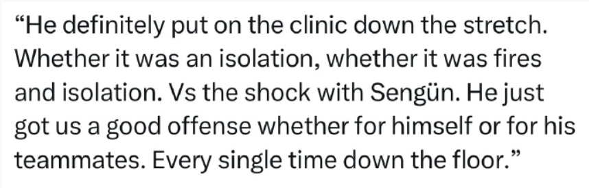 雷迪克表示,东契奇在末节打出了“教科书级”表现,同时也称赞了第四节首发阵容的一波攻势,让球队在第三节表现糟糕后重新找回活力:“他在末节关键时刻彻底秀翻了全场。无论是单打、挡拆后单打,还是面对申京的防守,他都能为球队打出高效进攻。不管是为自己创造机会,还是串联队友。每一个回合都如此。”