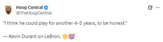 杜兰特在谈到詹姆斯时表示:“我不知道他想不想打那么久。但说实话,我觉得他还能再打4-5年,他的身体天赋,就是为了打这么久而生的。”