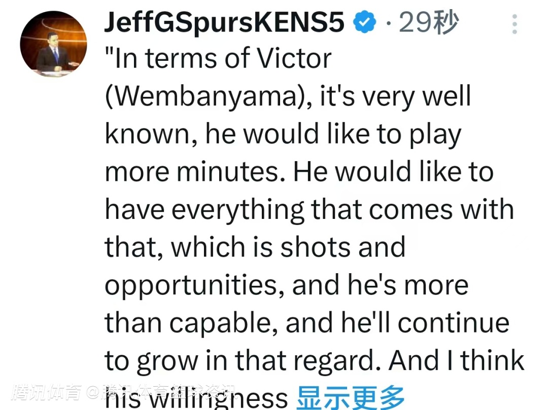 谈及文班亚马,米奇-约翰逊表示:“他想增加出场时间,这是众所周知的事,也希望随之获得更多出手和机会。他完全具备这个能力,后续还会持续进步。最让我印象深刻的,是他全身心投入比赛、完全服从战术安排的态度,不管是卡位掩护、拉开空间,还是吸引双人包夹为队友创造机会,他都做得很好,这些能力也会越来越强。”