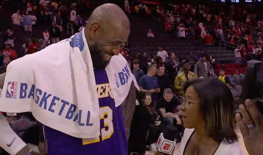 湖人客场124-116击败火箭豪取七连胜,詹姆斯赛后放弃冰敷手肘,专程返回场边接受ESPN记者Lisa Salters的采访,一句"我爱你,你太棒了"瞬间刷屏社交媒体。