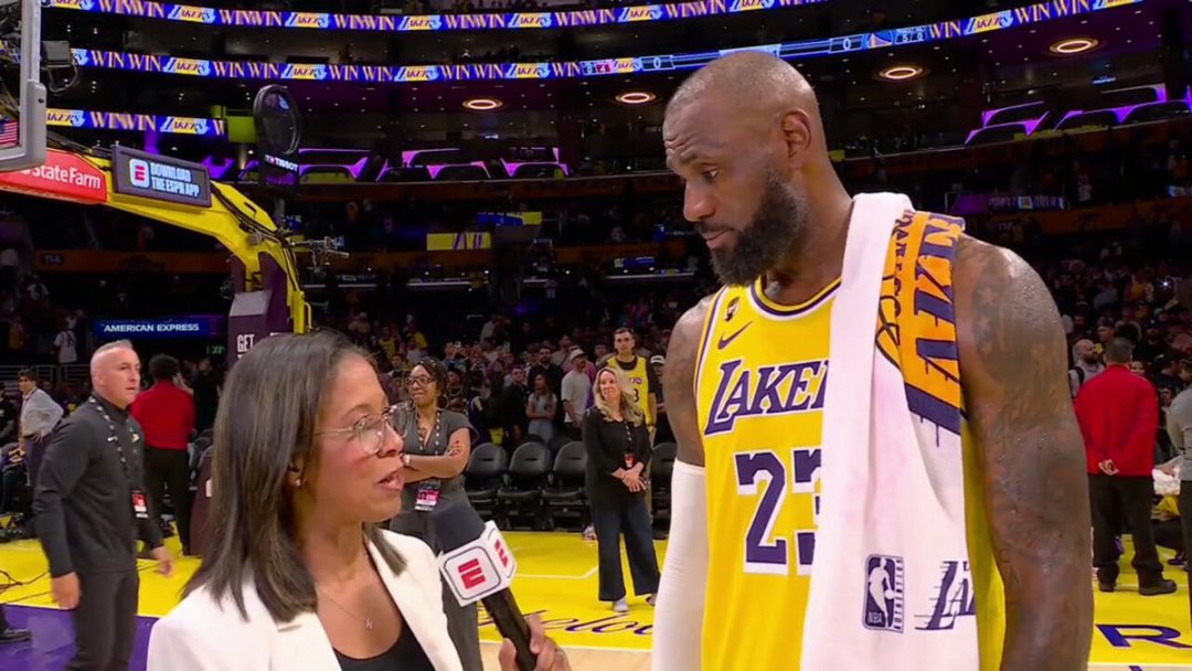 北京时间3月19日,湖人做客休斯敦,东契奇和詹姆斯联手带队拿下赛季第七场连胜。终场哨响后,41岁的詹姆斯原本要立刻回更衣室冰敷受伤的右肘,走到通道口时却转身折返,回到场边接受ESPN记者Lisa Salters的采访。