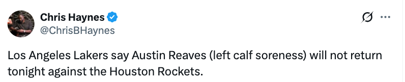 北京时间12月26日,NBA圣诞大战,湖人对阵火箭,湖人官方宣布,里夫斯因为左小腿酸痛,本场比赛不会回归。