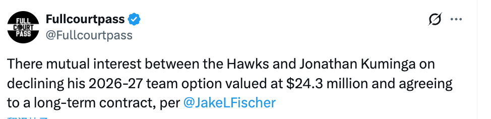 北京时间3月19日,据美记Jake Fischer报道,老鹰队与库明加双方有意(长期合作),老鹰准备放弃执行库明加2026-27赛季价值2430万美元的球队选项,并和他达成一份长期合同。