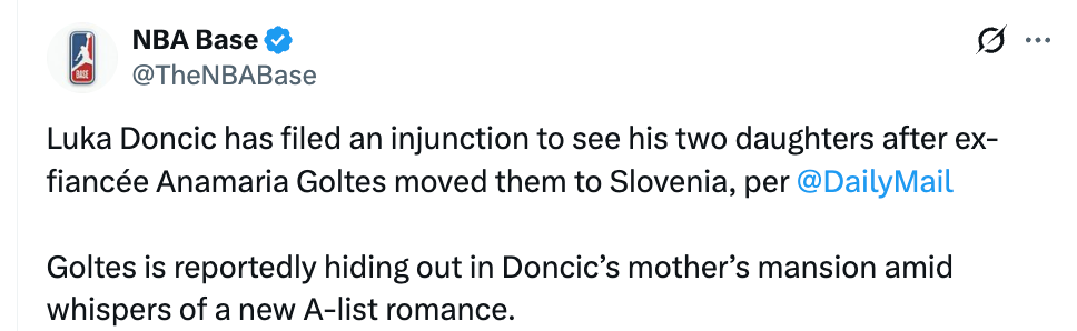 前不久,东契奇向ESPN证实,自己和未婚妻戈尔泰斯分手,并且在争夺两个女儿的监护权。早些时候,TMZ报道称戈尔泰斯已向法院提交诉状,向东契奇索要子女抚养费和律师费,了解情况的消息人士透露,该诉状是在加利福尼亚州提交的,东契奇的一个女儿去年春天仅在该州与他共同生活了三个月,他的另一个女儿从未到过该州,而东契奇对戈尔泰斯提交诉状一事毫不知情。