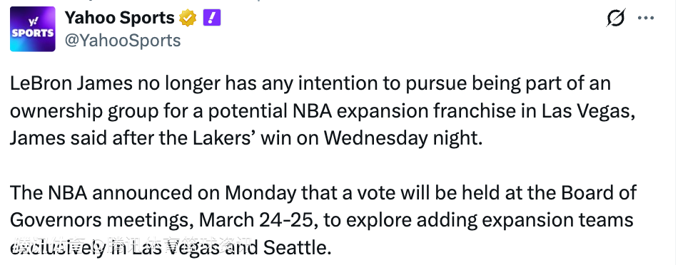 北京时间3月20日,据美媒雅虎体育报道,詹姆斯在接受采访时表示,自己已经不再有意加入拉斯维加斯潜在NBA扩张球队的所有权集团。