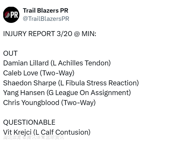 北京时间3月20日,NBA常规赛继续进行,开拓者明日对阵森林狼。赛前,开拓者官方公布球队最新伤情报告,杨瀚森因下放至发展联盟,继续无缘出战。