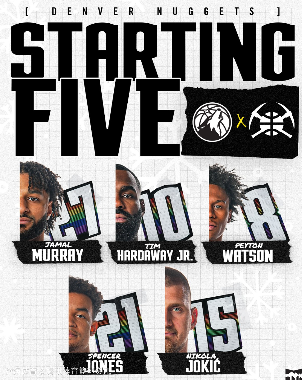 北京时间12月26日,NBA圣诞大战,掘金和森林狼的比赛将于今天上午11点30分打响,赛前双方公布了首发名单。