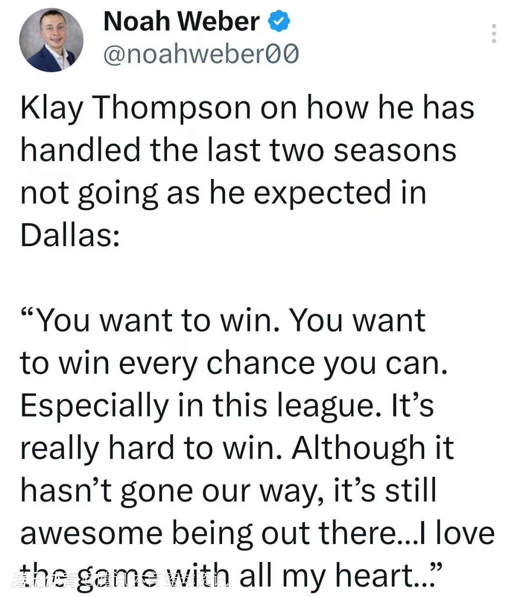 克莱说道:“说实话,你总想赢,每一次机会都不想放过,尤其是在这个联盟里。这就是竞技体育,赢球真的太难太难了。尽管事情没能如我们所愿,但能站在球场上依旧很棒。我发现自己太想念赛场了,我甚至不知道该怎么一个人待着。所以每晚看到比赛,我都会想:天啊,我真的应该还在场上。”
