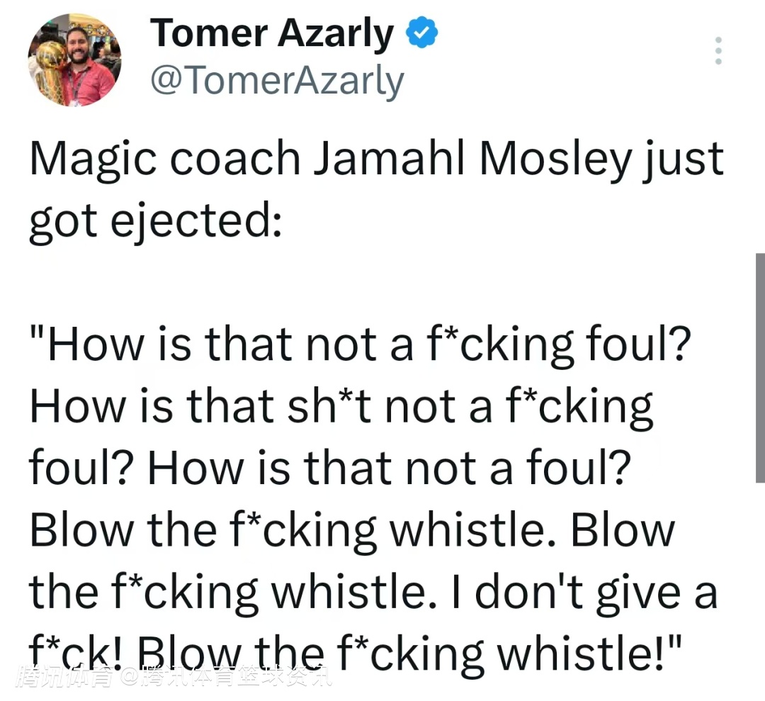 据现场原声显示,莫斯利向当场裁判怒吼道:““这TM怎么就不是犯规?这狗屁判罚怎么就不是犯规?这凭什么不是犯规?TM给我响哨啊!吹哨啊!我TM才不管!赶紧TM吹哨!”