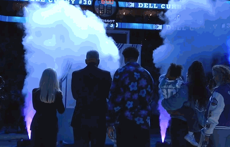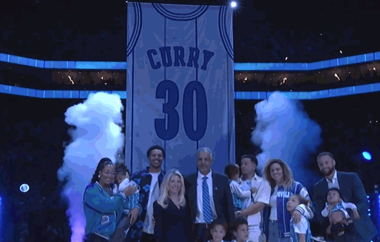 随后黄蜂队将戴尔-库里的30号球衣升上球馆顶部,他也与自己的家人一起合影留念。