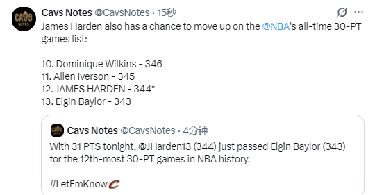 根据数据统计显示,这是哈登职业生涯第344次单场得分30+,他超越了埃尔金-贝勒,升至NBA历史第12位,目前在哈登身前的球员是艾弗森,而哈登与他仅剩1场差距。