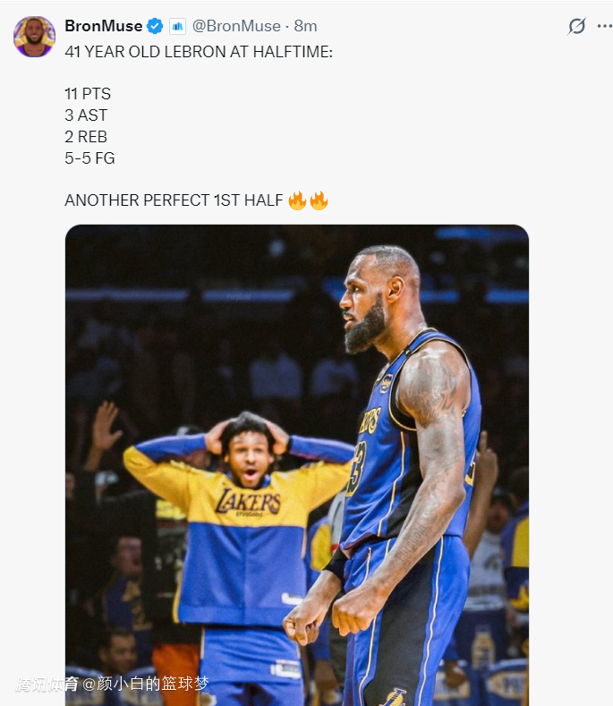 半场詹姆斯5中5,拿到11分3篮板2助攻,命中率100%,41岁的詹姆斯连续两个上半场保持全中!