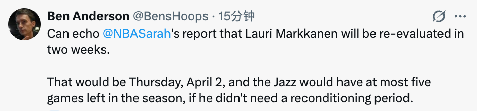 北京时间3月20日,据爵士队记萨拉-托德报道,马尔卡宁因髋部伤势,将在两周后复查,这一时间点为4月3日,若他无需额外的康复调整期,届时爵士本赛季的比赛就只剩下5场。