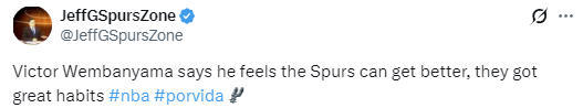在谈到马刺队的防守时,文班亚马说道:“我们已经有一阵子没打出这样的比赛了,很高兴我们依然具备这样的实力。我认为我们还能做得更好,我们可以养成更好的比赛习惯。”