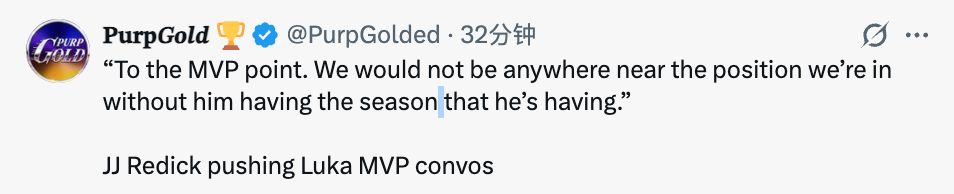 谈及东契奇MVP的竞争力,雷迪克直言:“如果不是他打出这样的赛季表现,我们绝不可能处在现在的位置。”