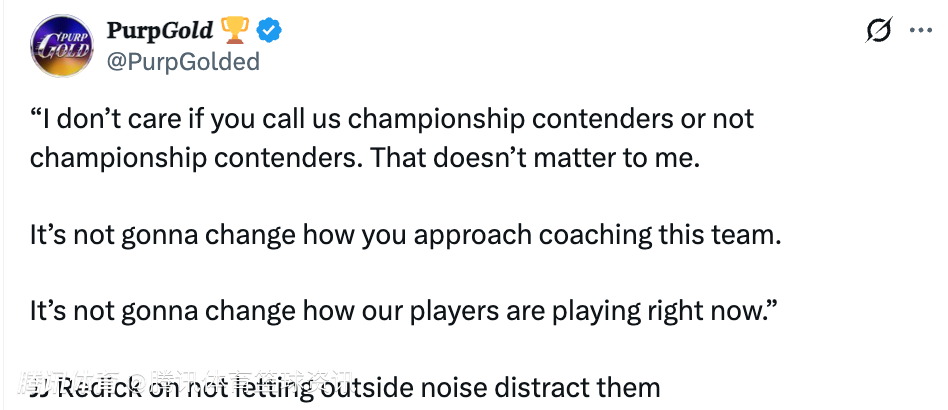 谈及外界对球队“争冠热门”的评价,雷迪克表示:“我不在乎你们把我们称作争冠热门还是非争冠热门,这对我来说毫无意义。这不会改变我执教这支球队的方式,也不会改变我们球员现在的比赛方式。”