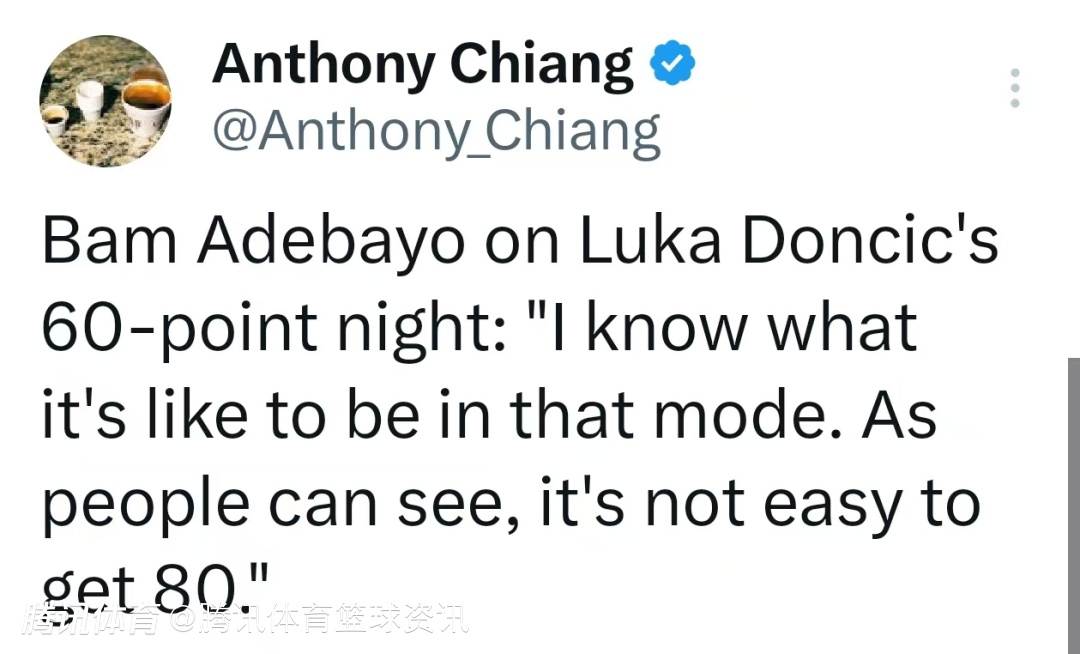 阿德巴约谈及东契奇本场轰下60分时说道:“我懂那种进入无解模式的感觉。大家也能看出来,想拿80分真的不容易。”
