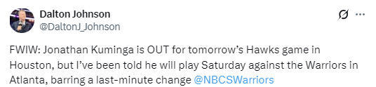 该记者写道:“库明加将缺席明天在休斯顿对阵老鹰的比赛,但据我获悉,除非出现最后时刻的变动,否则他会出战在亚特兰大对阵勇士的比赛。”