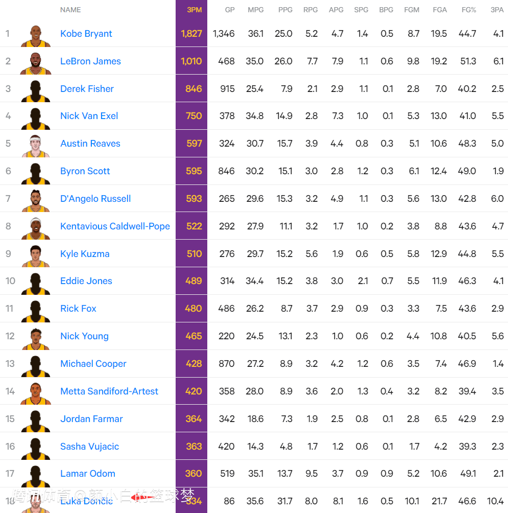 4.湖人生涯已经命中334个三分队史超魔术师升第18位;