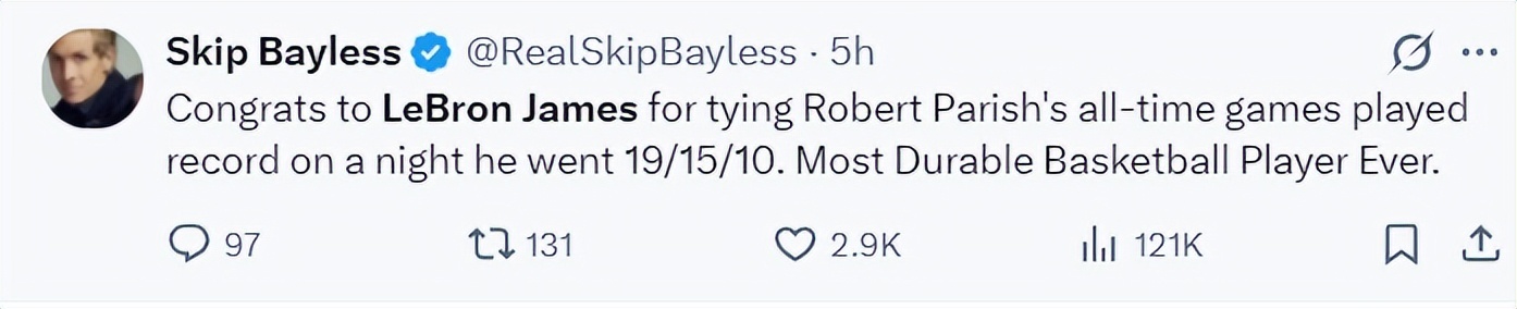 赛后最强詹黑斯利普-贝勒斯都被打服了,他写道:恭喜勒布朗打破了帕里什的生涯出场次数,他拿到19+15+10。他是有史以来最顽强的篮球运动员之一。