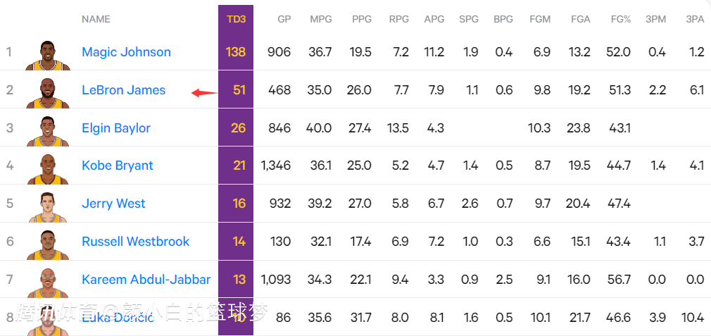 4.詹姆斯湖人队史第51次三双仅次于魔术师138次;