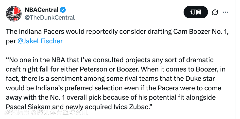 Fischer表示:“我咨询过的NBA圈内人士均预测,彼得森或布泽尔在选秀夜不会出现顺位大幅下滑的情况。事实上,在部分对手球队看来,即便步行者拿到状元签,这位杜克球星也会是他们的首选 —— 因为他与西亚卡姆以及新援祖巴茨的适配性潜力极高。”