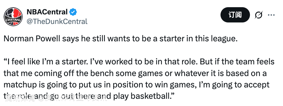 鲍威尔表示:“我觉得自己就是首发级别的球员,我一直为这个角色努力着。但如果球队认为,让我在某些比赛里打替补,或是根据对位情况来安排我的出场方式,能让我们更有机会赢球,我会接受这个角色,然后上场好好打球。”
