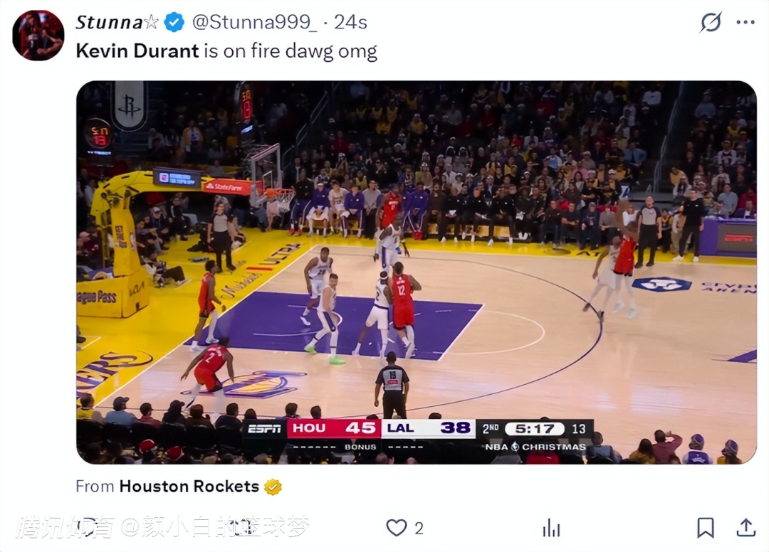 休媒晒出杜兰特的数据写道:杜兰特打一号位带领火箭赢得比赛。