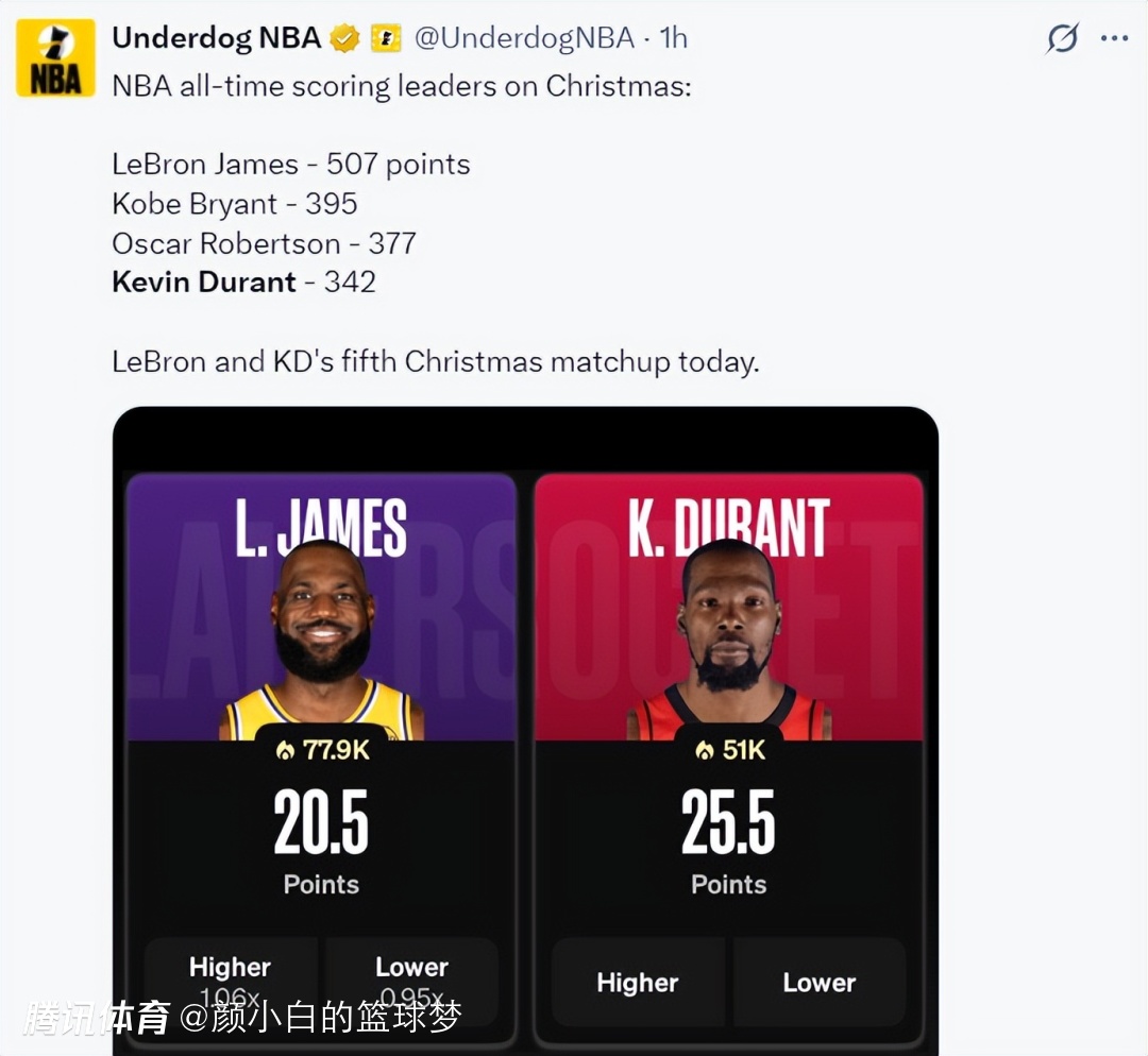 37岁的杜兰特VS41岁的勒布朗,两位超级巨星的年终大战看点十足,詹姆斯是年终大战得分榜第一(第20场),杜兰特是是年终大战得分榜第四(第13场)。开场杜兰特的手感一般7中3+三分2中1拿到7分1篮板2助攻1盖帽。
