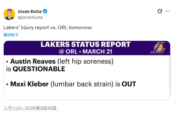 北京时间3月21日,NBA常规赛继续进行,湖人明日对阵魔术。赛前,湖人方面公布球队本场比赛伤病报告,里夫斯出战成疑。