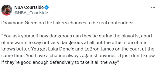 “在季后赛系列赛里,这种套路也就管用一两场,他们很快就能找出破解战术的打法,到时候你就只能换回常规防守,然后问题就又回到了湖人赛季初的老毛病上。所以我不确定他们的防守强度是否足以一路夺冠,但他们在季后赛里永远是危险的存在。毕竟你阵中有詹姆斯,还有东契奇。”