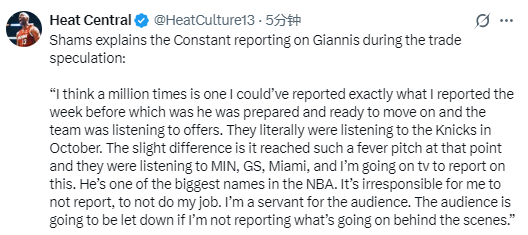 Shams表示:“我无数次想过,其实我本可以就按前一周的报道口径来说——他已经做好离队准备,而球队也在倾听报价。早在10月份,雄鹿就真的在和尼克斯接触谈判。唯一的细微差别是,当时交易流言已经彻底引爆,球队同时还在听取森林狼、勇士、热火的报价,而我要上电视报道这件事。”