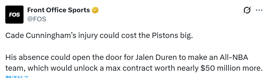 杜伦本赛季首次入选全明星,是最佳阵容的边缘人选。坎宁安出局后,最佳阵容的15个名额将多出一席。2023-24赛季起,NBA取消位置限制,最佳阵容不再分后卫、前锋、中锋。对于受限自由球员杜伦而言,入选最佳阵容将彻底改变他的续约行情。