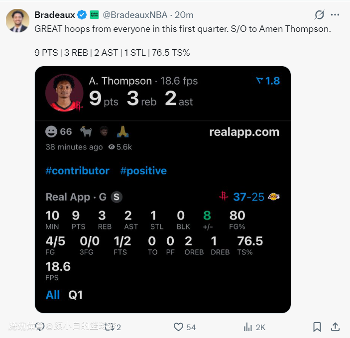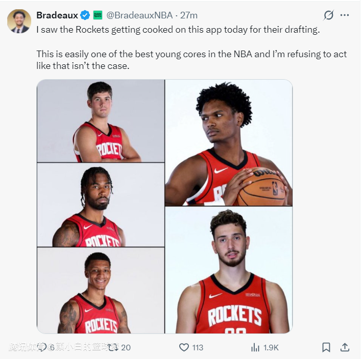 火箭记者Bradeaux:赛前我在社媒上看到有人说火箭因为选秀的年轻球员遭遇连败。我想说的是,这肯定是联盟最出色的年轻团队之一。