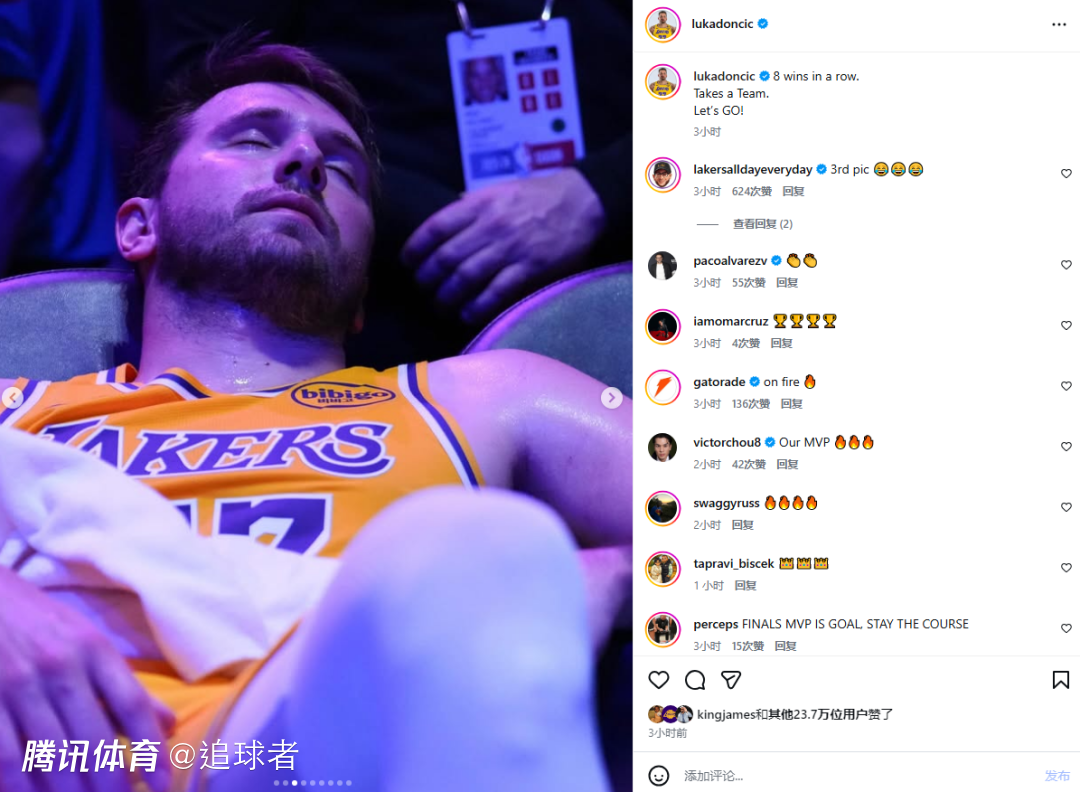 今日东契奇在社媒上晒照庆祝豪取8连胜,其中有一张自己闭眼累瘫的画面,东契奇的动态引热议,詹姆斯、范德比尔特等人为卢卡点赞。