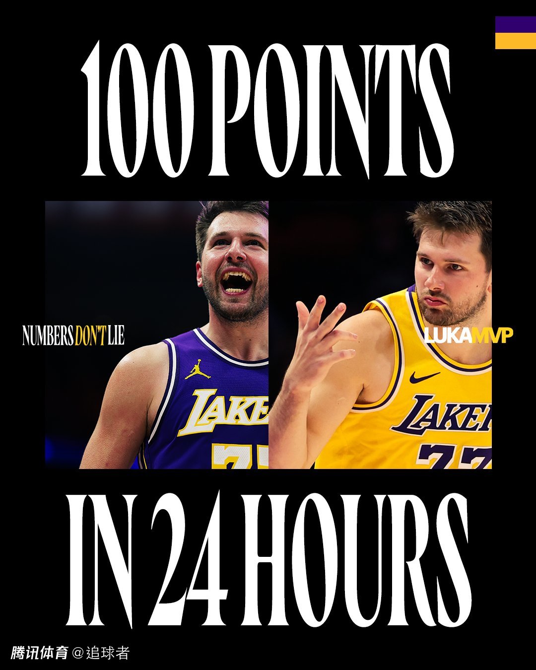 东契奇背靠背轰下100分,湖人官方晒海报庆祝并且写道:东契奇在24小时内得到100分,数据不会说谎,这不仅仅是数据,这更是一种宣言。