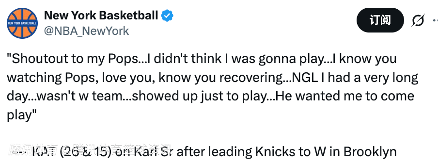 “我知道你在看,老爸,我爱你。我知道你现在正在康复,我很快就会回去陪你。我这两天真的特别难熬,昨天一整天、今天一整天都很漫长。我没有跟球队待在一起,我一直在照顾家人。我今天来,就只是为了打球。我想为我的队友们出战,我想站在这里,和他们在一起。我父亲也是一样,他凭着仅有的那点力气,也希望我能上场比赛。所以我很开心自己能够出战。非常感谢大家,也请大家为我和我的家人祈福。”