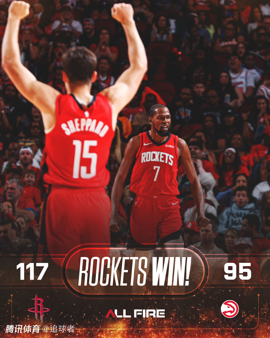 重返首发的谢泼德表现出色,进攻端输送三分,防守端积极拼抢,帮助火箭终结连败;赛后火箭官方晒赢球海报,谢泼德携手杜兰特成封面人物。