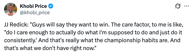 湖人在上场24分惨败太阳后,雷迪克曾指出球队缺少足够多、能稳定付出努力的防守者,今晚他进一步表示,队里的球员打球不够上心,而且总是同一批人出问题。他还补充说,自己可不想再这么熬53场比赛了:“球员们嘴上都会说想赢,但在我看来,‘上心程度’其实是‘我是否足够在乎,愿意踏踏实实地做好该做的事,并且始终如一’。而这恰恰是总冠军级别的习惯,也是我们现在所欠缺的。”