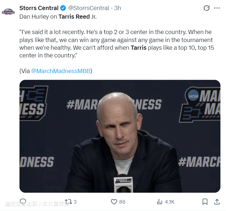 赛后康大主帅丹-赫利场边接受采访,他说道:这场比赛看起来里德真的像一头灰熊。