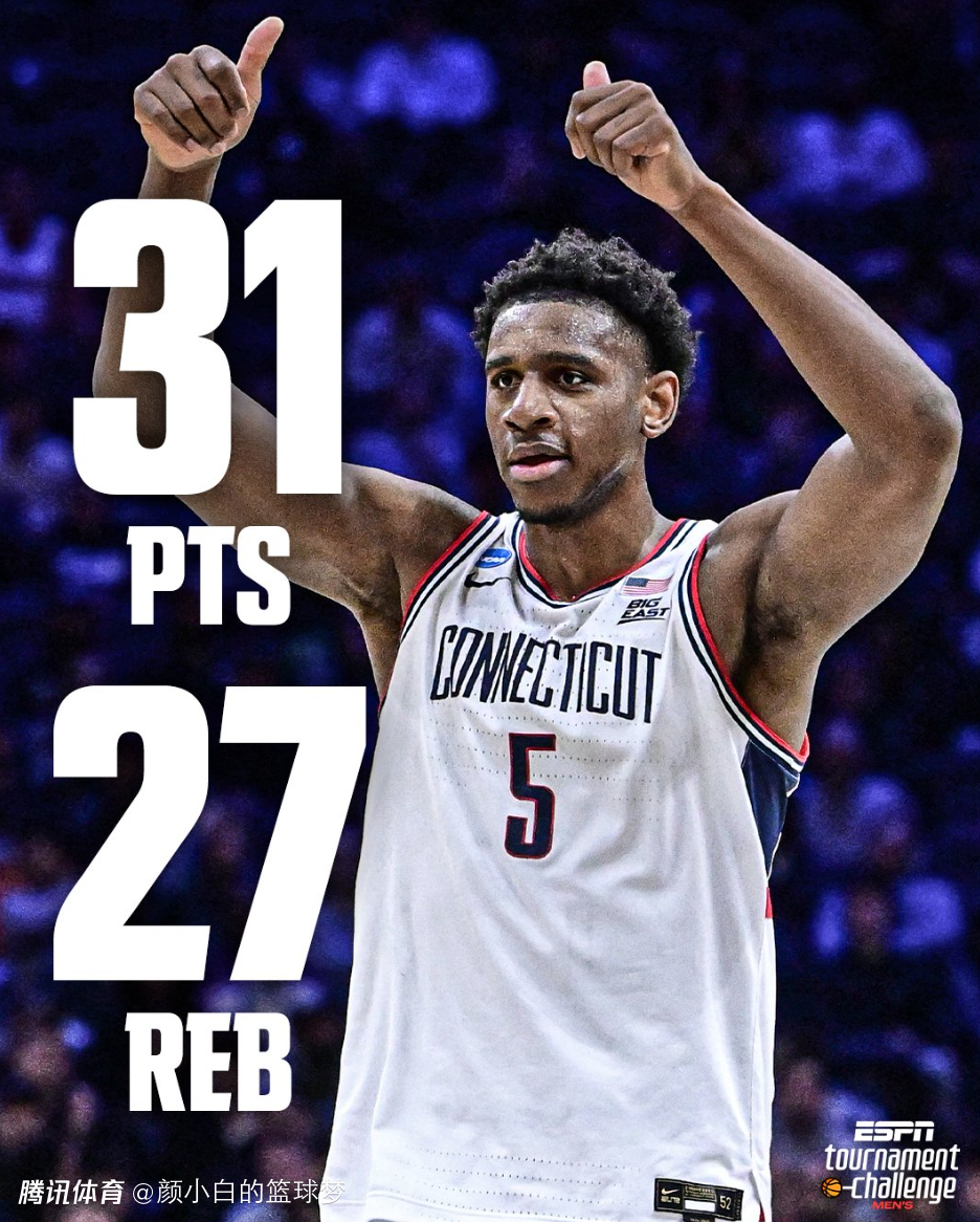 此役身高2.11米的小塔里斯-里德,34分钟,15中12,罚球9中7,拿到31分27篮板3助攻,命中率80%,这场比赛打出了NCAA生涯最高的一场比赛。