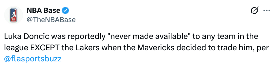 据当时名记Shams报道,这笔交易是在暗中很快达成的,詹姆斯不知道这件事情,浓眉也不知道这件事情,东契奇也对这笔交易感到震惊。