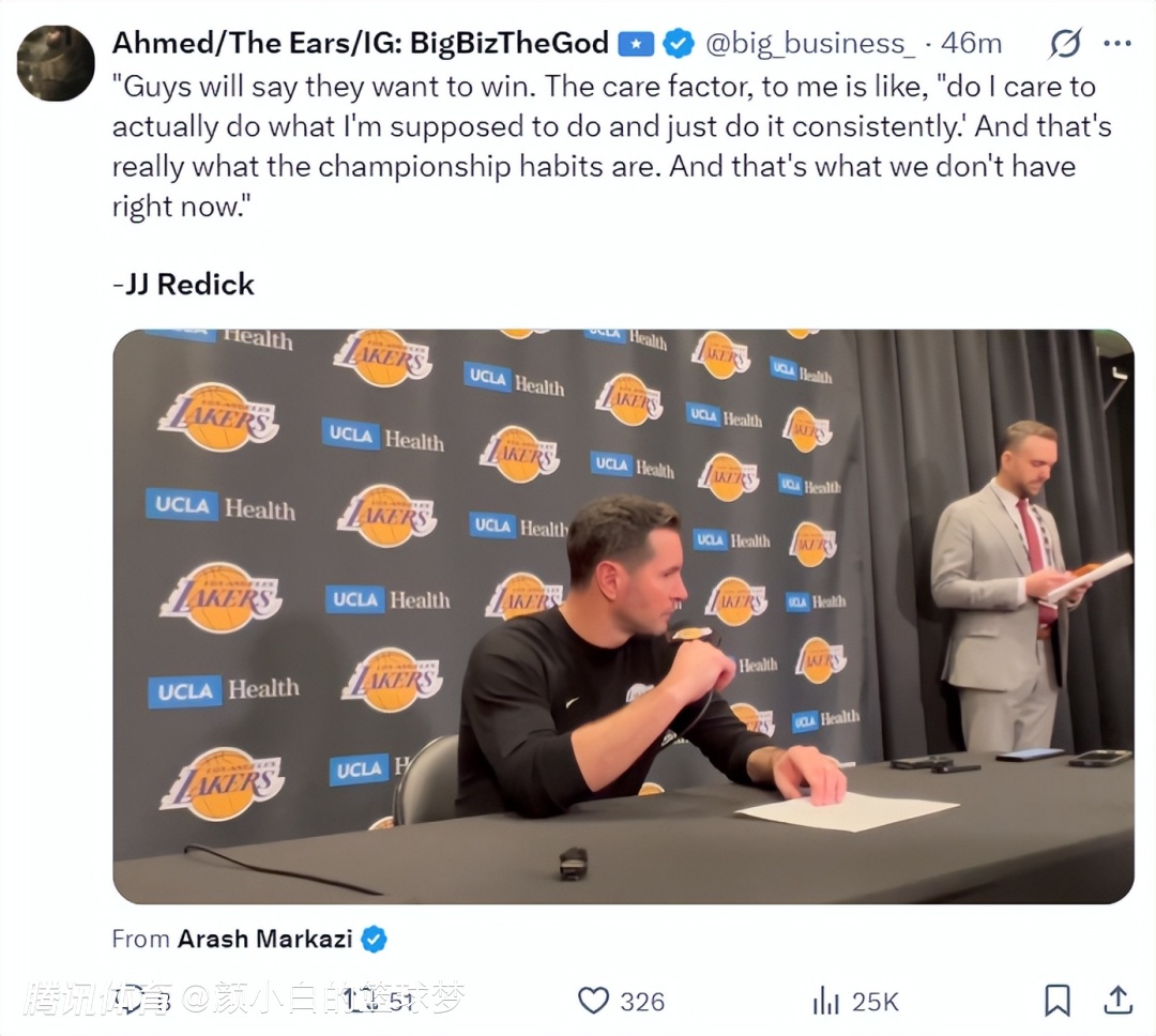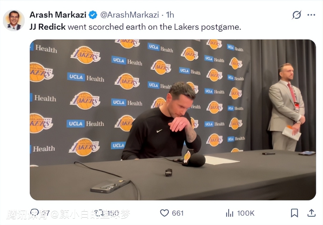 赛后雷迪克对湖人全队的表现特别的不满,他透露在湖人输给太阳后刚刚才进行了一场令人不太舒服的复盘/录像分析,以解决球员在场上漫不经心、不退防、不轮转等问题,但这场比赛湖人全队依旧跟复盘之前一样。