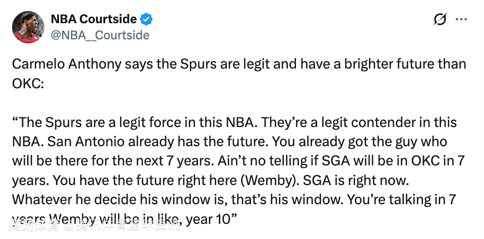 甜瓜表示,马刺是真正的实力派,并且未来前景比雷霆队更光明:“马刺是NBA里一支实打实的劲旅,是真正的争冠球队。圣安东尼奥已经握有未来,你已经拥有了一位能在这里扎根7年的核心(文班亚马)。没人能保证7年后亚历山大还会留在雷霆。”