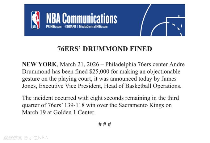 NBA官方表示,76人队中锋德拉蒙德因在场上做出不雅手势,被罚款25000美元。NBA篮球运营执行副总裁詹姆斯-琼斯公布了这一处罚决定。该事件发生在周五76人队客场以139比118战胜国王队的比赛中,第三节还剩8秒时。