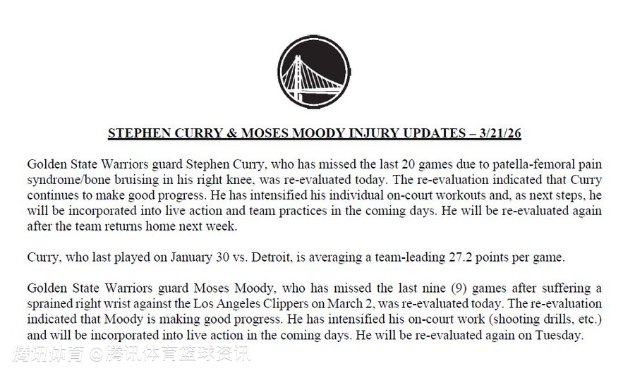 北京时间3月22日,勇士官方发布公告,更新库里及穆迪的伤情进展。