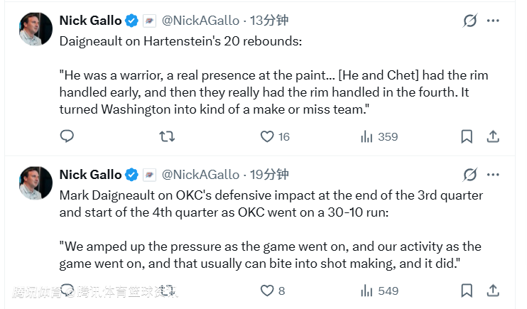 谈到哈尔滕施泰因抢下20个篮板时,戴格诺特说道:“他打得就像一个斗士,在内线极具存在感……他和切特早早守住了篮筐,到了第四节更是牢牢护住禁区。这让奇才只能变成一支靠手感吃饭、看命得分的球队。”